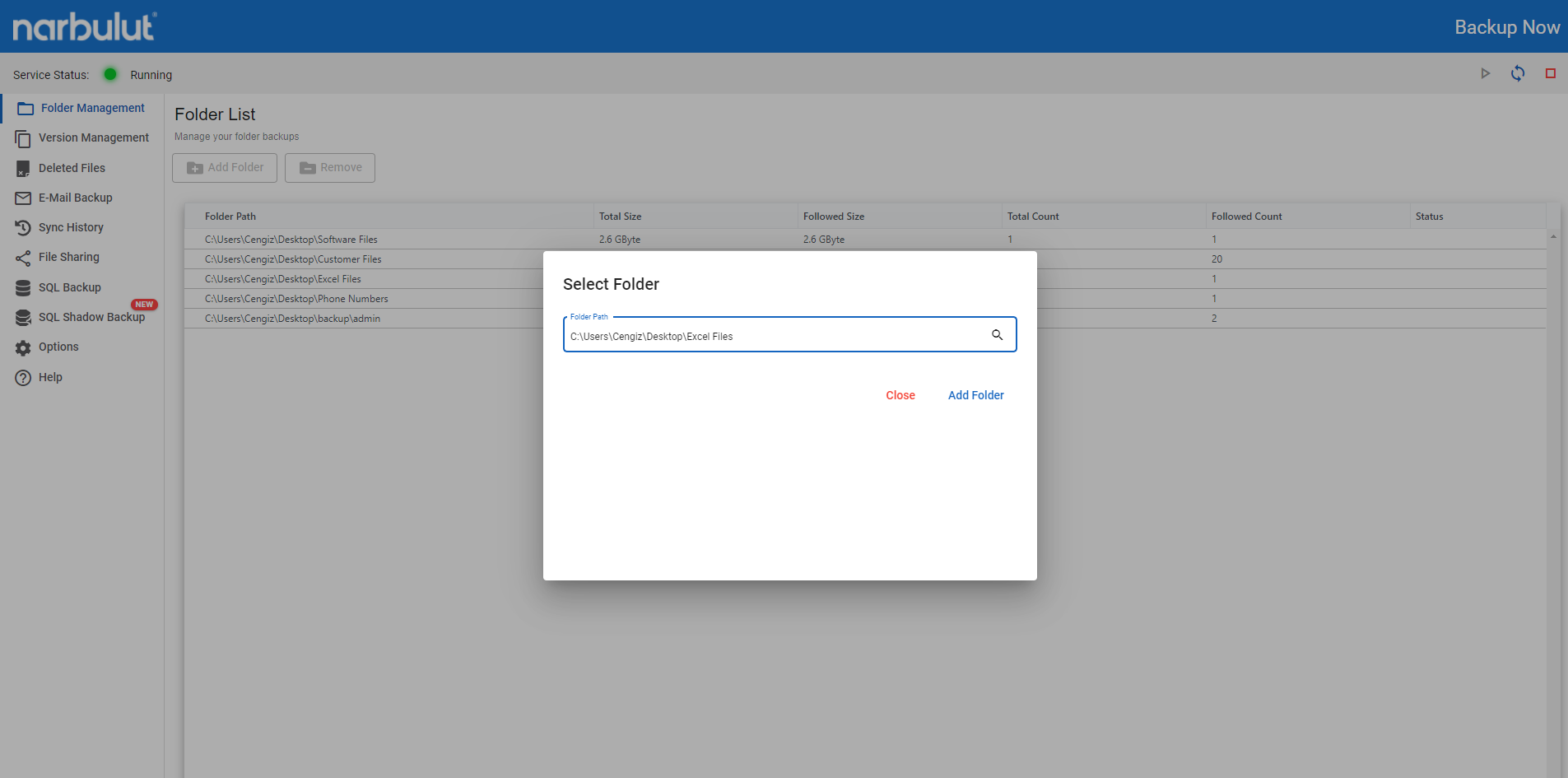 Select the folders you want to back up with the "Add Folder" button in the Backup Now application or drag the folders onto the application.