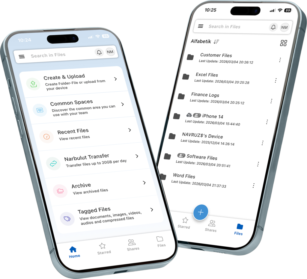 You can back up your contacts, photos and videos with Narbulut Mobile App. You can store and share your files and folders and collaborate with your teammates.