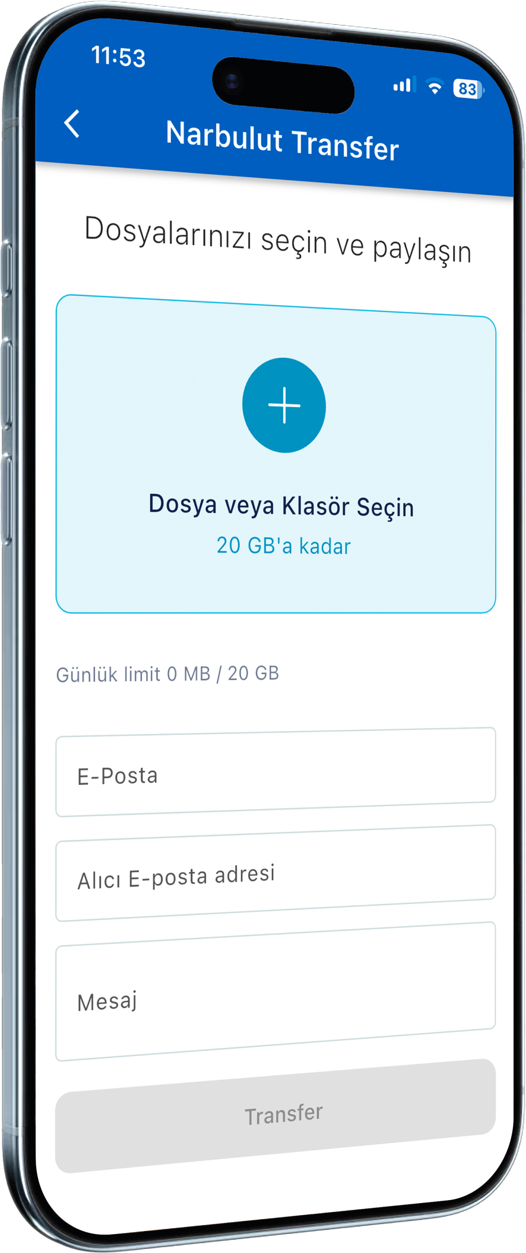 Yüksek boyutlu dosyaları uygulama içinden yükleyin ve gönderin.