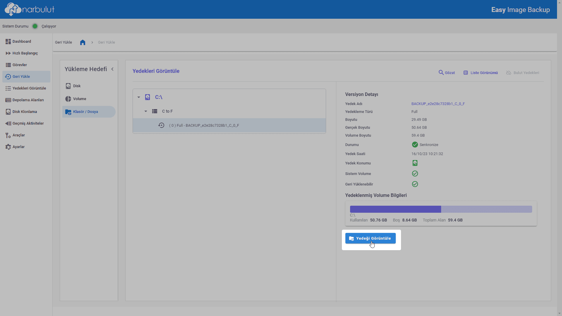 - Klasör/dosya bazlı geri yükleme yapmak için Narbulut Easy Image Backup uygulamasında Geri Yükle menüsüne gidin. Yükleme hedefi seçimini Klasör / Dosya olarak yapın. İçerisindeki verilere ulaşmak için bir imaj yedeği seçin ve Yedeği Görüntüle butonuna tıklayın.