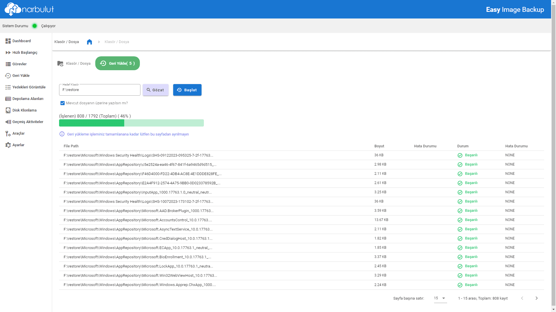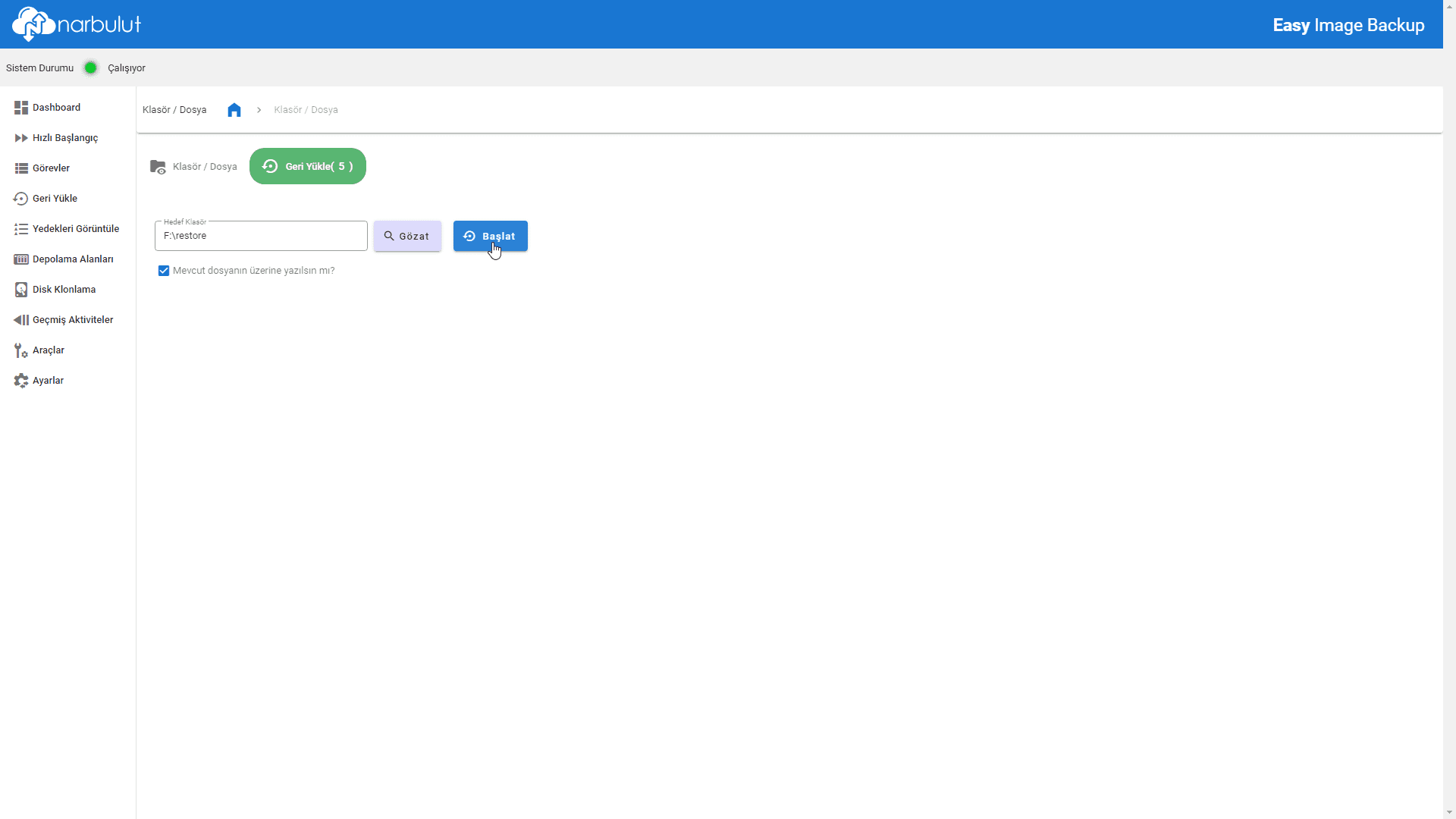 3. Gözat butonunu kullanarak geri yükleme yapılacak hedef dizini seçin. Hedef dizinde aynı isimli dosyalar ile karşılaşılması halinde üzerine yazma yapılıp yapılmayacağına karar verin. Başlat butonu ile geri yükleme işlemini başlatın.