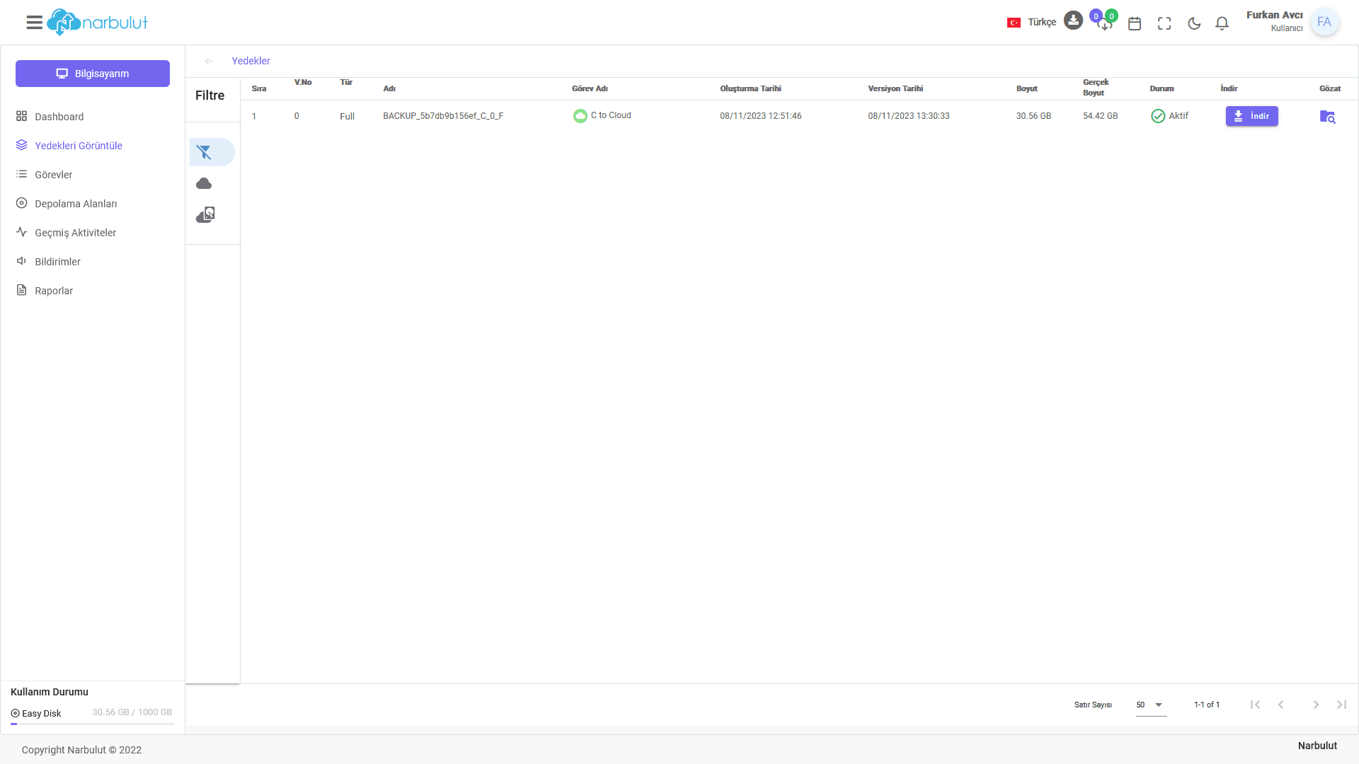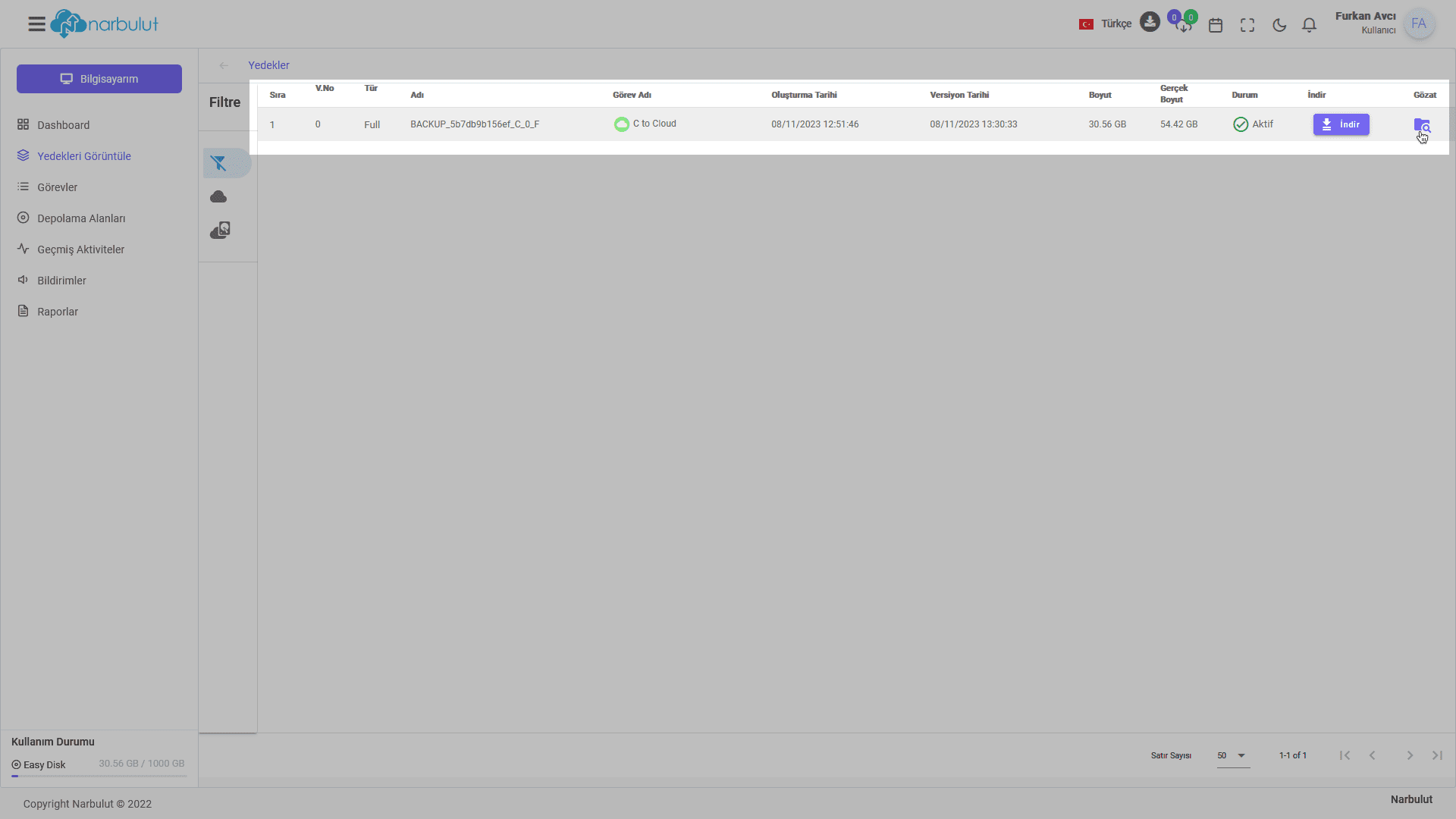 1. Narbulut web paneline (login.narbulut.com) giriş yapın. Ürünler > Easy Image Backup > Yedekleri Görüntüle menüsüne gidin.