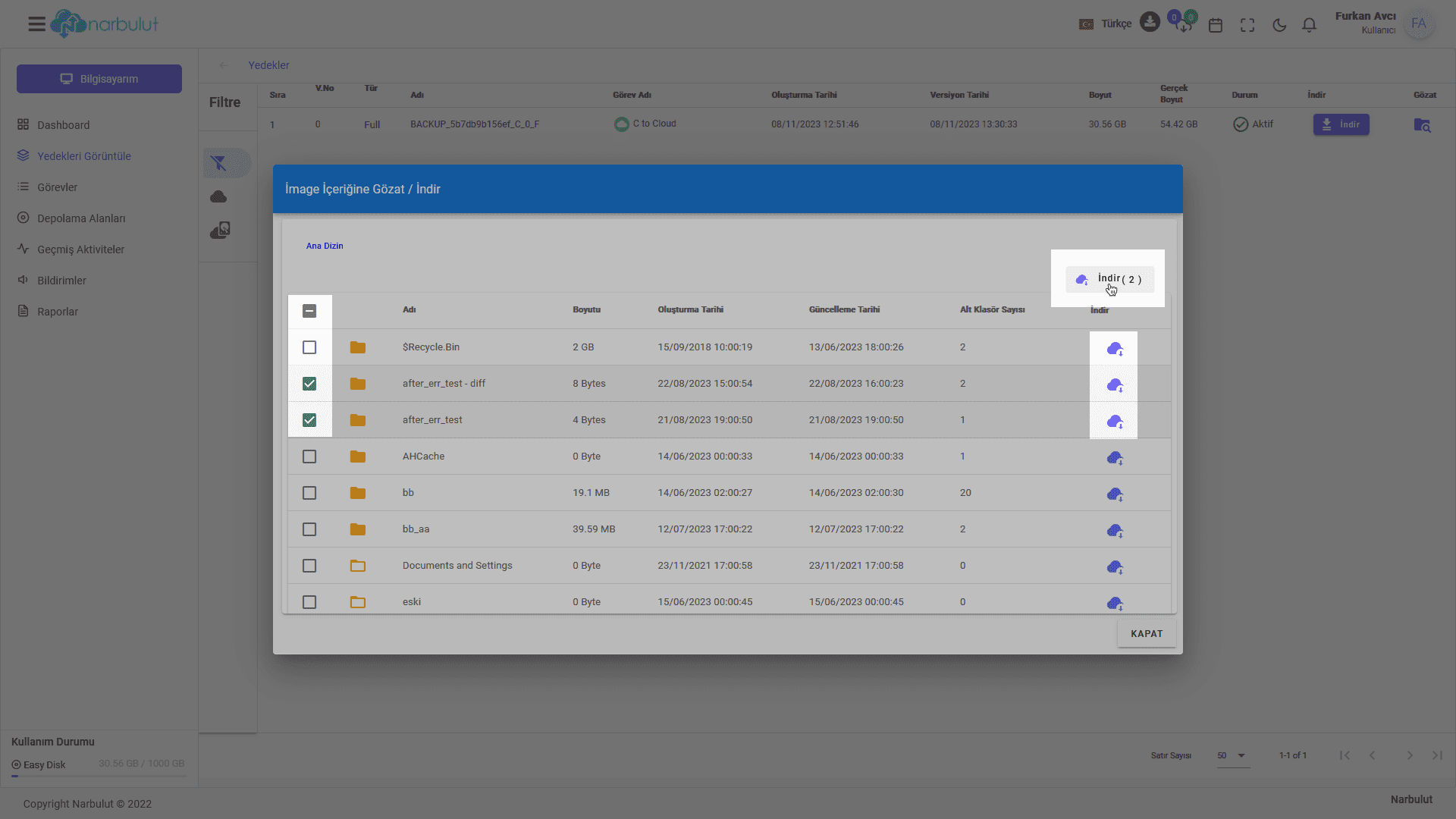 Narbulut Web Panel Üzerinden Klasör/Dosya Bazlı Geri Yükleme