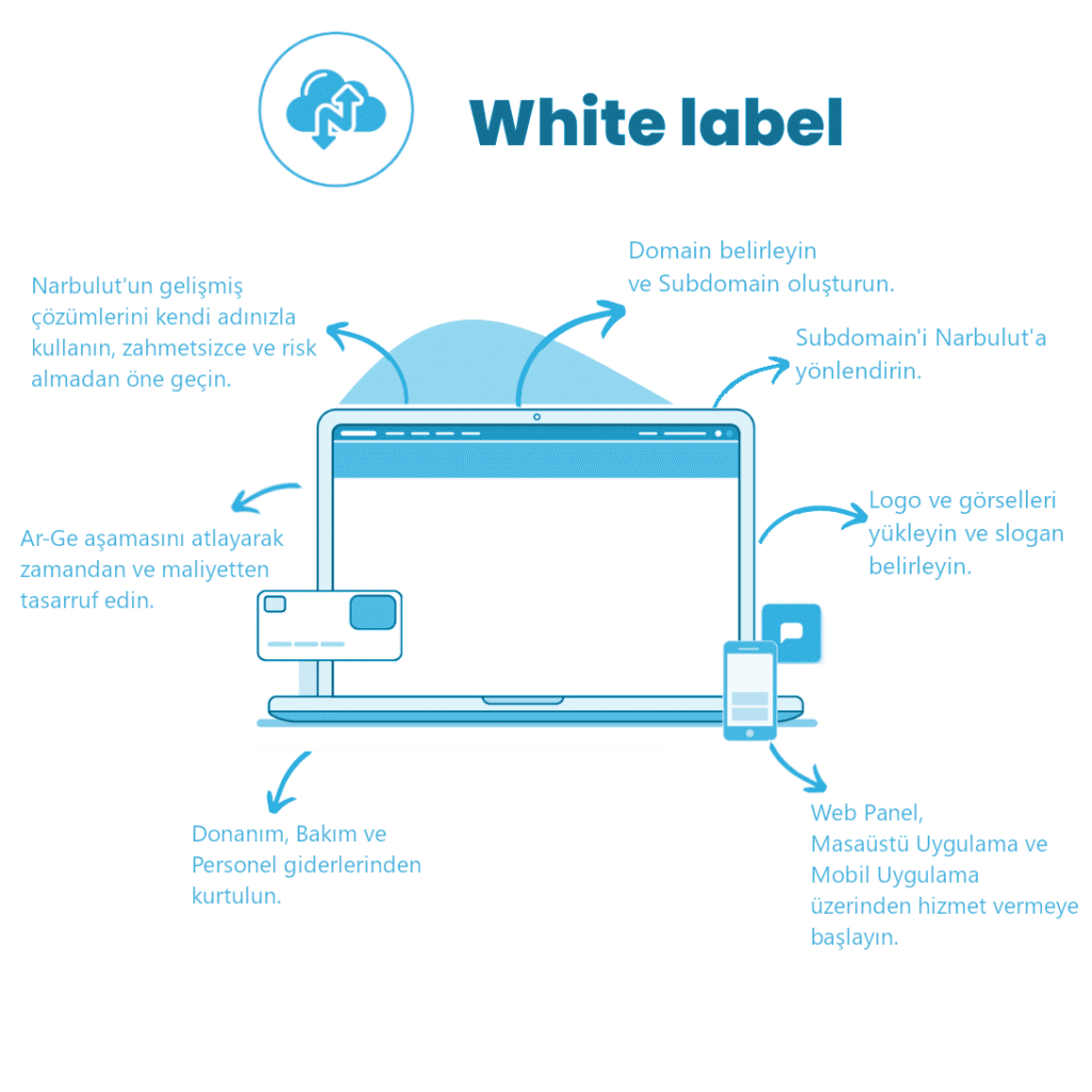 White Label, şirketlere üreticilerin ürünlerini yeniden markalandırmasına ve kendi markaları altında satmasına olanak tanıyan bir hizmettir. Bu sayede şirketler kendi ticari markalarını üretim ve AR-GE için harcama yapmadan minimum maliyetle oluşturabilirler. Narbulut, firmaların üretim ve bakım zahmetine girmeden kendi markalarını oluşturup kendi ürünlerini satmaya başlamalarını kolaylaştıran white label özelliği sunar.