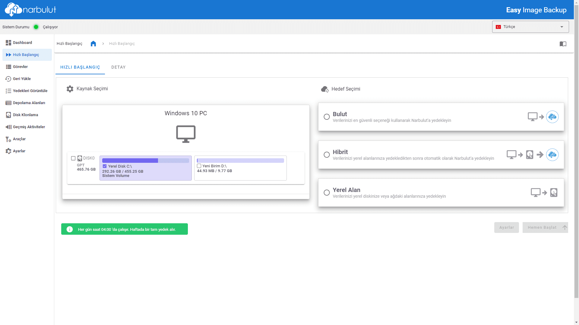 1. Narbulut Easy Image Backup uygulamasında Hızlı Başlangıç menüsüne girin.